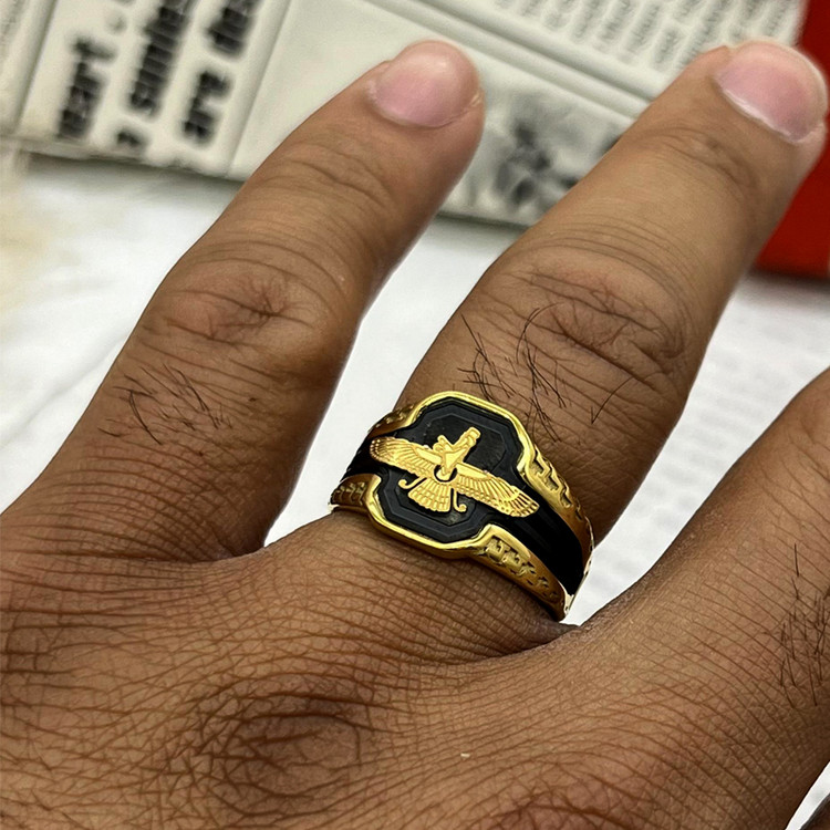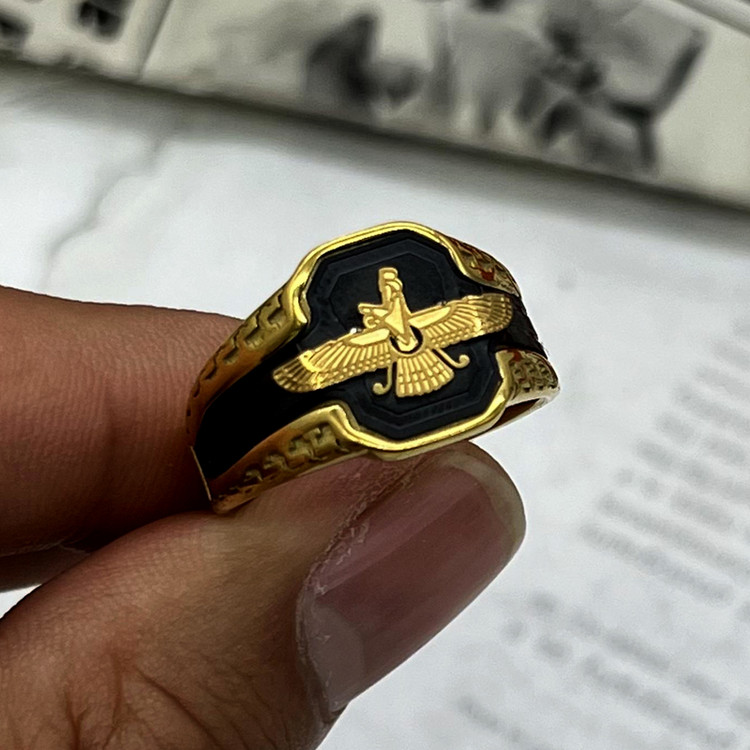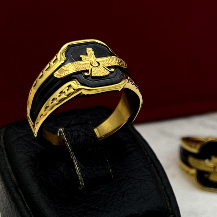 انگشتر فروهر طلایی مردانه بسیار شیک و زیبا و اصیل که یکی از نمادهای کهن و بسیار اصیل ایران زمین میباشد که استفاده از آن روی انگشتر از دیرباز محبوب و پر طرفدار بوده است. این انگشتر طرح فروهر ساخته شده از استیل عیار 316L با بالاترین کیفیت آبکاری رنگ ثابت و ضد حساسیت و در سایزبندی 9 10 11موجود و قابل سفارش میباشد. ترکیب رنگ طلایی و مشکی روی انگشتر زیبایی این انگشتر را دوچندان نموده است. اگر دنبال خرید هدیه ای اصیل و ماندگار هستی، پیشنهاد میکنم خرید انگشتر فروهر مردانه رو از دست ندی.