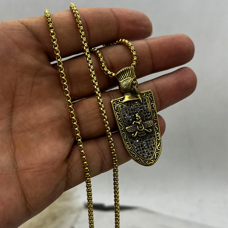 گردنبند فروهر خاص مردانه بسیار شیک و زیبا مزین به سر ستون های تخت جمشید یکی از اصیل ترین و محبوب ترین گردنبندهای ایران اصیل میباشد. این پلاک زنجیر فروهر طلایی ساخته شده از استیل عیار 316 با بالاترین کیفیت آبکاری رنگ ثابت و ضد حساسییت میباشد و دارای زنجیر ویتالی 60 سانت که قابل کوتاه شدن میباشد و طراحی آن به گونه ای بوده که قابل استفاده آقایان و بانوان میباشد.