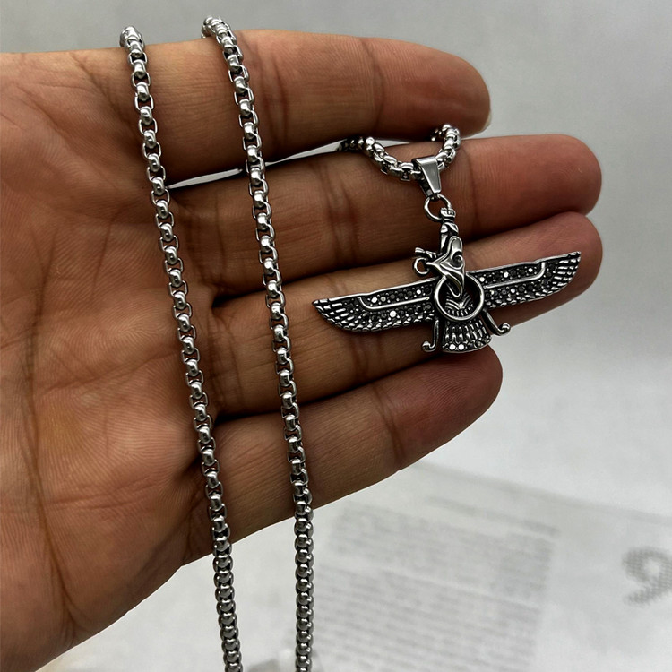 پلاک زنجیر اهورامزدا بسیار خاص و زیبا با ظاهری فوق العاده شیک نگین کاری شده که جز پر فروش ترین گردنبندهای ایران باستان و اصیل میباشد. این آویز فروهر مردانه ساخته شده از استیل عیار 316L بالاترین کیفیت رنگ ثابت و ضد حساسیت و دارای زنجیر ویتالی 60 سانت که قابل کوتاه شدن میباشد. طراحی این گردنبند اهورامزدا استیل به گونه ای بوده که قابل استفاده آقایان و بانوان میباشد. اگر به تاریخ کهن ایران علاقمندی، پیشنهاد میکنم خرید گردنبند اهورامزدا مردانه را از دست ندی.