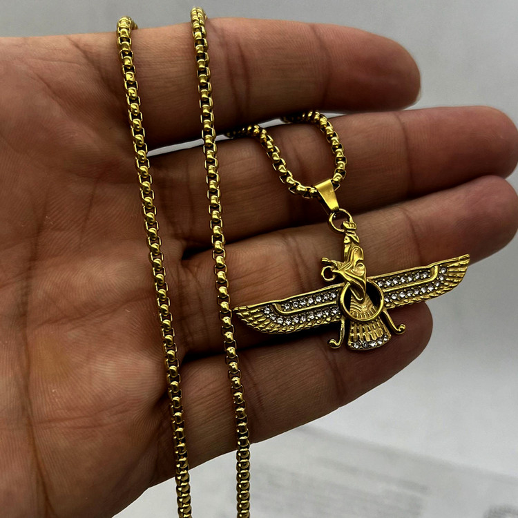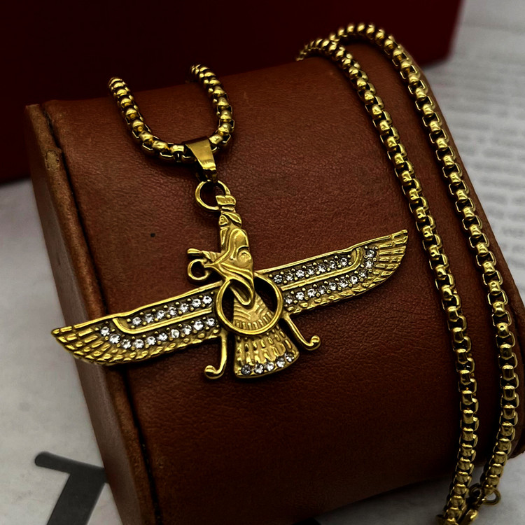 گردنبند اهورامزدا طلایی بسیار خاص و زیبا نگین کاری شده مناسب آقایان و خانم هایی که به تاریخ و فرهنگ ایران کهن علاقمند هستند. فروهر یکی از قدیمی ترین نمادهای ایران باستان و اصیل که محبوب و پر طرفداره مخصوصا اگر پلاک اهورامزدا طلایی باشه. این گردنبند اهورامزدا اصیل دارای زنجیر ویتالی 60 سانت که قابل کوتاه شدن میباشد.