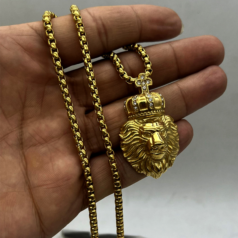 گردنبند شیر نگین دار بسیار شیک و زیبا که روی پلاک شمایل شیر و تاج نگین دار کار شده که زیبایی و درخشندگی این پلاک زنجیر شیر را دو چندان نموده است. این گردنبند شمایل شیر طلایی ساخته شده از استیل عیار 316L با بالاترین کیفیت آبکاری رنگ ثابت و مشابه طلا و دارای زنجیر ویتالی 60 سانت که قابل کوتاه شدن میباشد.