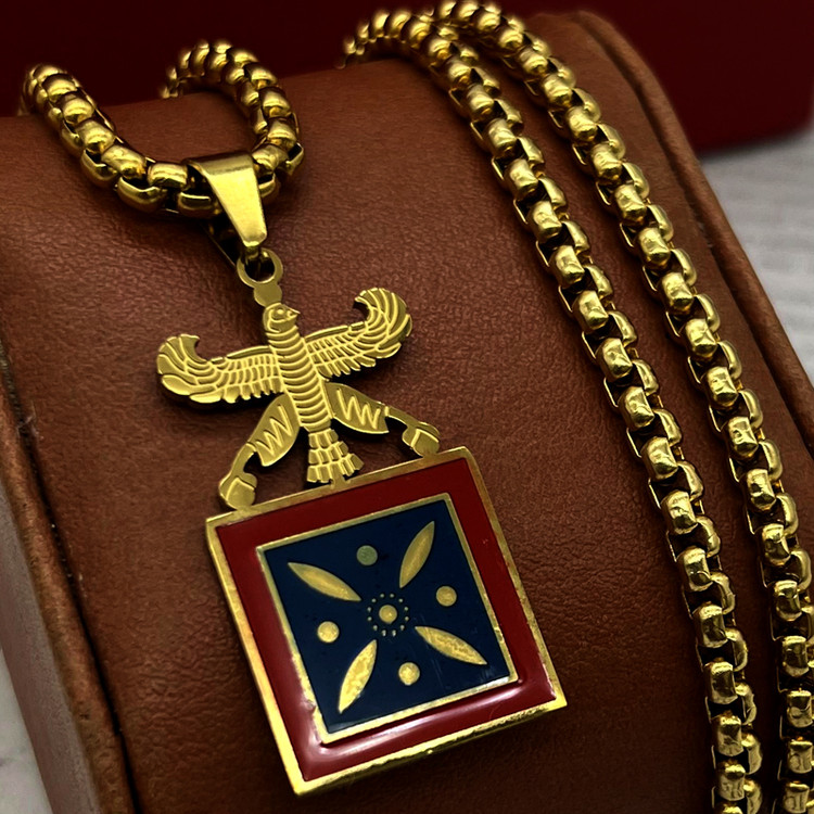 گردنبند درفش کاویانی یا همان گردنبند درفش شهباز که یکی از کهن ترین و اصیل ترین نمادهای دوره ساسانی که نماد پرچم ایران در آن دوره بوده است. این گردنبند استیل درفش کاویانی ساخته شده از استیل عیار 316L با بالاترین کیفیت آبکاری رنگ ثابت و ضد حساسیت و دارای زنجیر ویتالی 60 سانت که قابل کوتاه شدن میباشد. این گردنبند طرح درفش کاویانی به گونه ای طراحی شده که مناسب استفاده آقایان و بانوان میباشد. اگر به تاریخ کهن ایران علاقمندی و میخواهی یه نماد اصیل ایرانی همیشه همراهت باشه، پیشنهاد میکنم قیمت و خرید گردنبند درفش کاویانی رو از دست ندی.