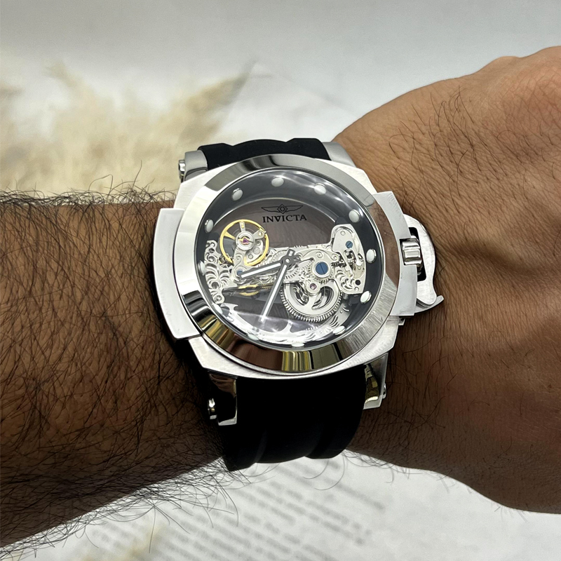 این ساعت اتوماتیک اینویکتا به موتور مکانیکی دقیق مجهز شده که بدون نیاز به باتری و تنها با حرکت دست کار میکند. وجود پشت شیشهای ساعت امکان مشاهده عملکرد منظم موتور را فراهم میکند؛ جزئیاتی که حس اصالت و کیفیت ساعتسازی را بهخوبی منتقل مینماید.