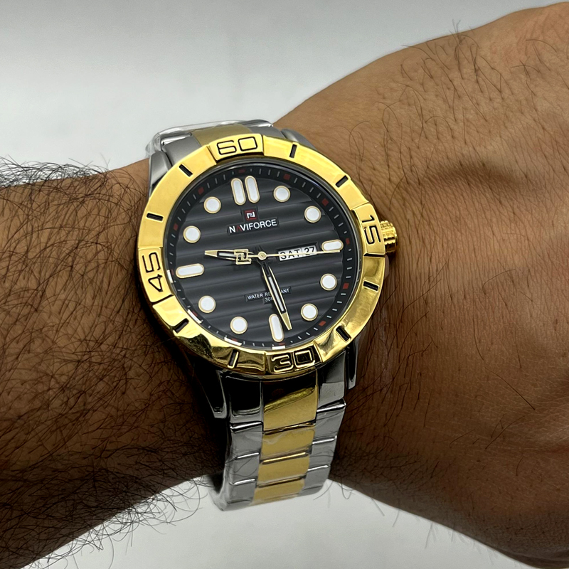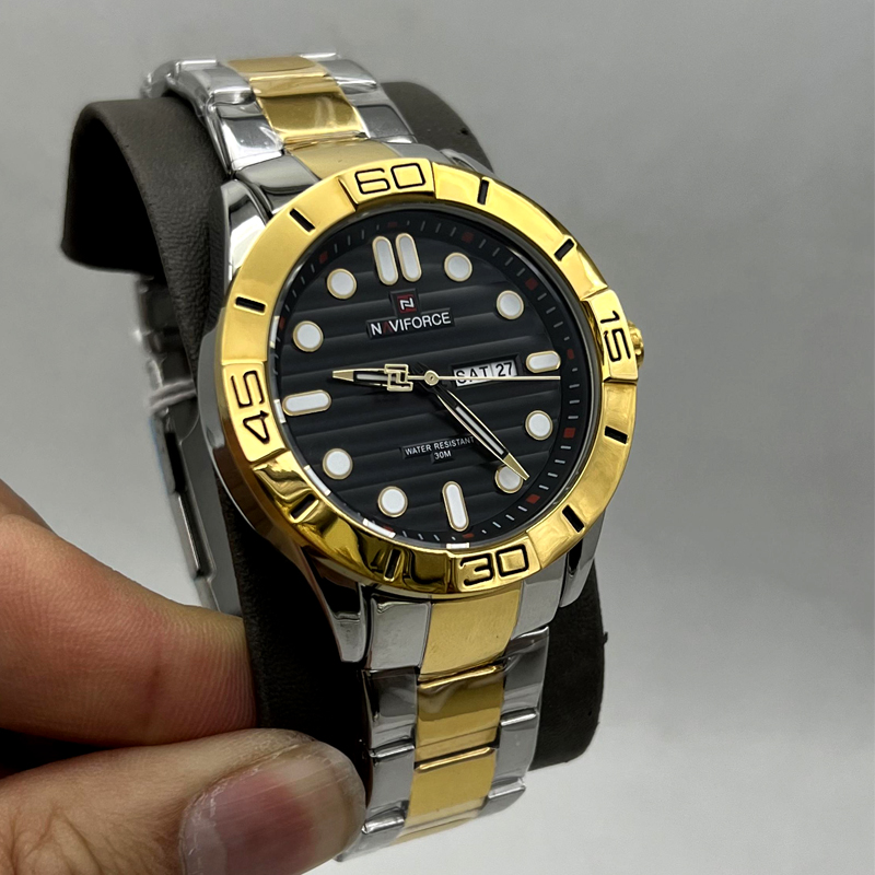 ساعت مردانه نیوی فورسNAVIFORCE تک موتوره با ترکیب رنگ طلایی و استیل یکی از ساعت های زیبا و جذاب برای استایل اسپورت میباشد. این ساعت نیوی فورس 9198 دارای موتور قدرتمند میوتا ژاپن ، قاب و بند استیل عیار 316 با بالاترین کیفیت آبکاری رنگ ثابت و ضد حساسیت میباشد. این ساعت دارای تقویم، ضد آب و با ملزومات شناسنامه اورجینال،جعبه و بگ اصلی و کارت گارانتی یکساله شرکتی تقدیم شما میشود.